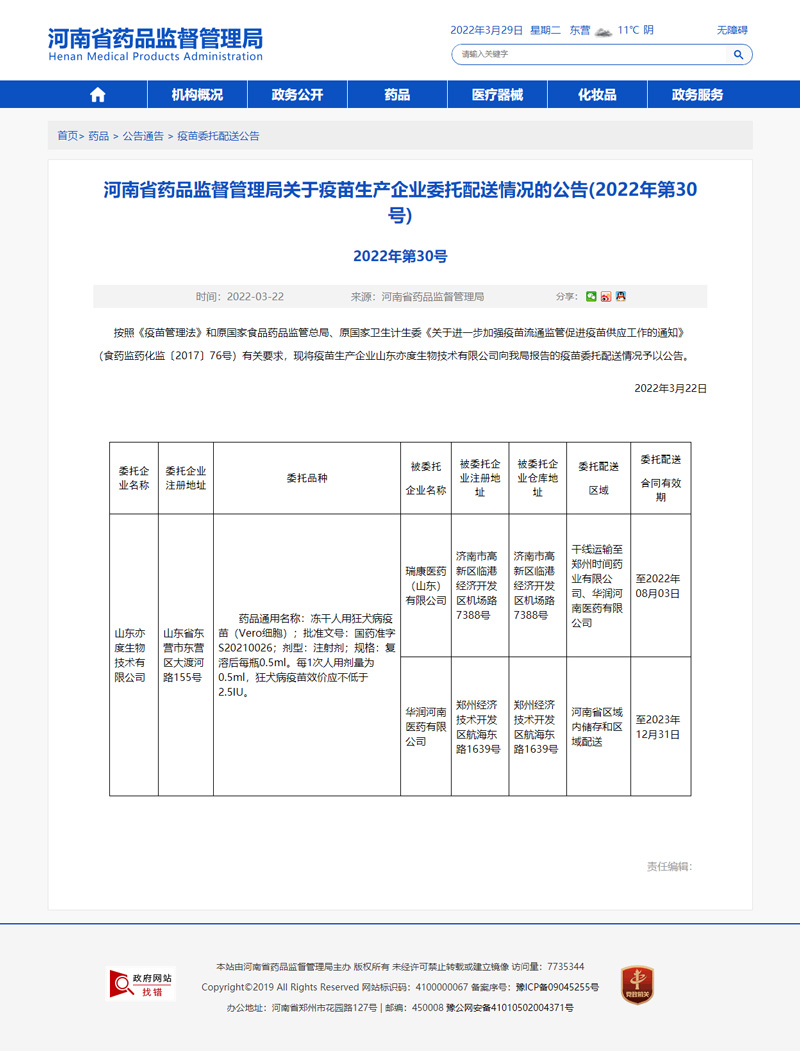 河南省藥品監(jiān)督管理局關于疫苗生產(chǎn)企業(yè)委托配送情況的公告(2022年第30號)