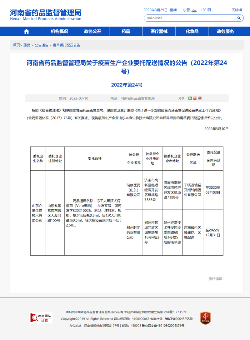 河南省藥品監(jiān)督管理局關于疫苗生產(chǎn)企業(yè)委托配送情況的公告(2022年第24號)